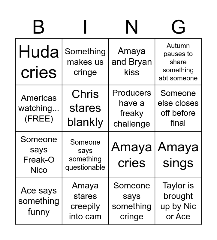 This bingo card has 16 words: Amaya stares creepily into cam, Amaya sings, Amaya and Bryan kiss, Huda cries, Someone says Freak-O Nico, Something makes us cringe, Amaya cries, Someone says something cringe, Americas watching... (FREE), Chris stares blankly, Ace says something funny, Autumn pauses to share something abt someone, Someone says something questionable, Someone else closes off before final, Producers have a freaky challenge and Taylor is brought up by Nic or Ace.