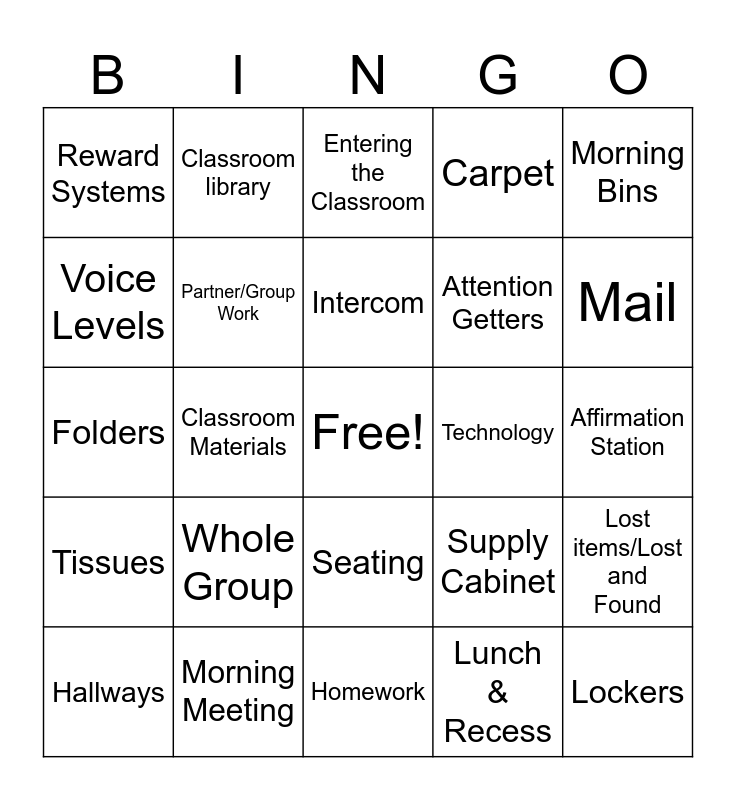 This bingo card has a free space and 44 words: Arrival, Lockers, Lining up, Hallways, Bathroom & Water, Lunch & Recess, Entering the Classroom, Dismissal, Morning Bins, Morning Meeting, Carpet, Technology, Seating, Whole Group, Independent Work, Homework, Turning in work, Folders, Desks, Mail, Classroom library, Classroom jobs, Early finishers, Reward Systems, Actions and Consequences, Affirmation Station, Nurse, Band Aid, Supply Cabinet, Tissues, Floors, Lost items/Lost and Found, Guests, Hand Signals, Classroom Materials, Pencils, Personal Materials, Emergencies, Intercom, Voice Levels, Attention Getters, Transitions/Brain breaks, Partner/Group Work and Sharing ideas.