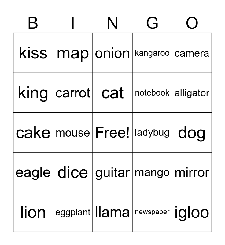 This bingo card has a free space and 81 words: oven, olive, onion, otter, oyster, owl, octopus, orange, ostrich, key, kick, kite, kangaroo, kiss, koala, king, dolphin, dice, duck, dog, deer, camera, cake, cat, carrot, bear, banana, bee, bicycle, apple, alligator, astronaut, llama, lemon, lion, ladybug, jet, jeans, jellyfish, juice, igloo, iguana, ice cream, island, mouse, monkey, map, money, mushroom, moon, mango, mirror, milk, hippo, helicopter, heart, horse, hyena, happy, goat, guitar, flag, flamingo, frog, fish, fox, elephant, egg, ear, earth, eye, eagle, eggplant, nurse, nut, nest, net, newspaper, nose, notebook and night.