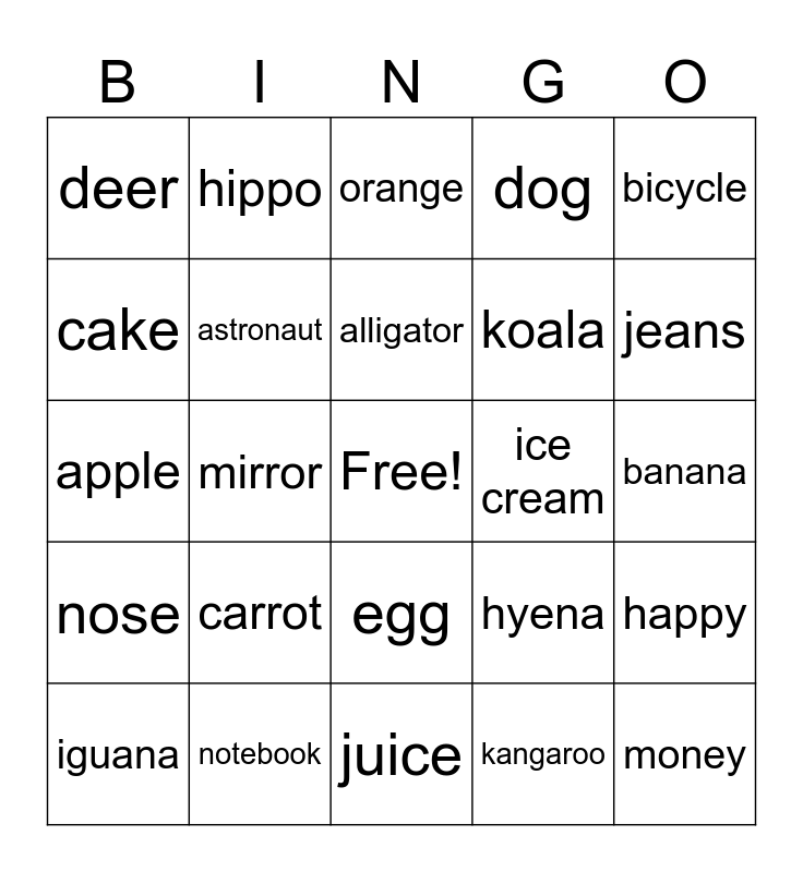 This bingo card has a free space and 81 words: owl, octopus, orange, ostrich, oven, olive, onion, otter, oyster, dolphin, dice, duck, dog, deer, camera, cake, cat, carrot, bear, banana, bee, bicycle, apple, alligator, astronaut, llama, lemon, lion, ladybug, jet, jeans, jellyfish, juice, igloo, iguana, ice cream, island, mouse, monkey, map, money, mushroom, moon, mango, mirror, milk, hippo, helicopter, heart, horse, hyena, happy, goat, guitar, flag, flamingo, frog, fish, fox, elephant, egg, ear, earth, eye, eagle, eggplant, nurse, nut, nest, net, newspaper, nose, notebook, night, key, kick, kite, kangaroo, kiss, koala and king.