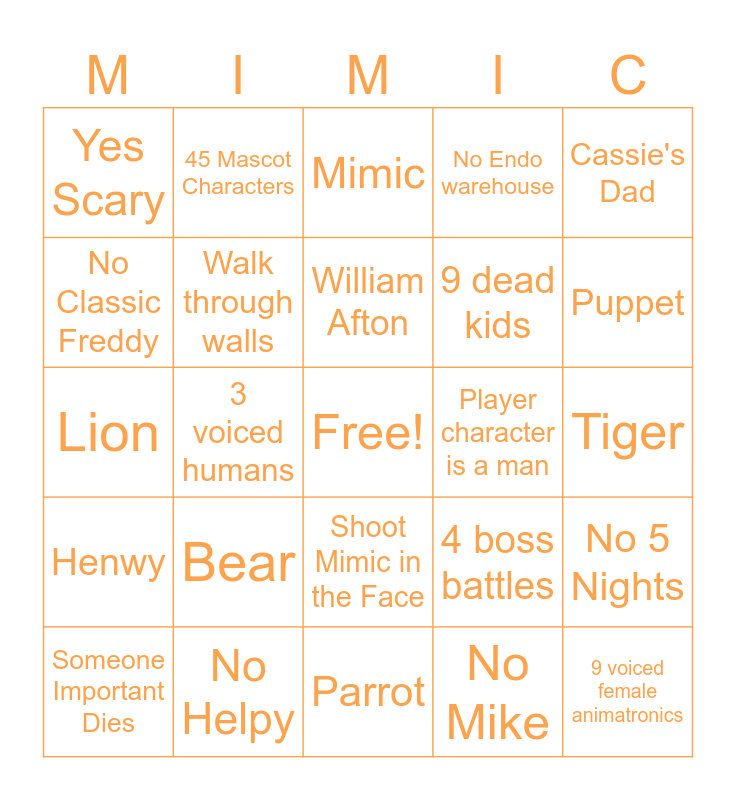 This bingo card has a free space and 24 words: Bear, No Helpy, William Afton, Someone Important Dies, Cassie's Dad, Yes Scary, No Classic Freddy, 45 Mascot Characters, Player character is a man, Shoot Mimic in the Face, 9 dead kids, Lion, 4 boss battles, No 5 Nights, Walk through walls, No Mike, Tiger, Mimic, Puppet, 3 voiced humans, 9 voiced female animatronics, Henwy, No Endo warehouse and Parrot.