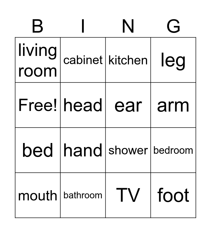 This bingo card has 16 words: bathroom, bedroom, kitchen, living room, bed, cabinet, shower, TV, Free!, head, mouth, leg, hand, arm, ear and foot.