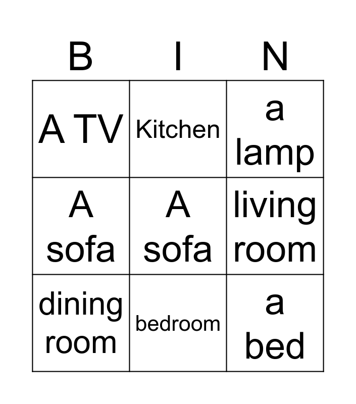 This bingo card has a free space and 11 words: bathroom, bedroom, a bed, dining room, Kitchen, a lamp, living room, a mirror, A sofa, A TV and A TV.