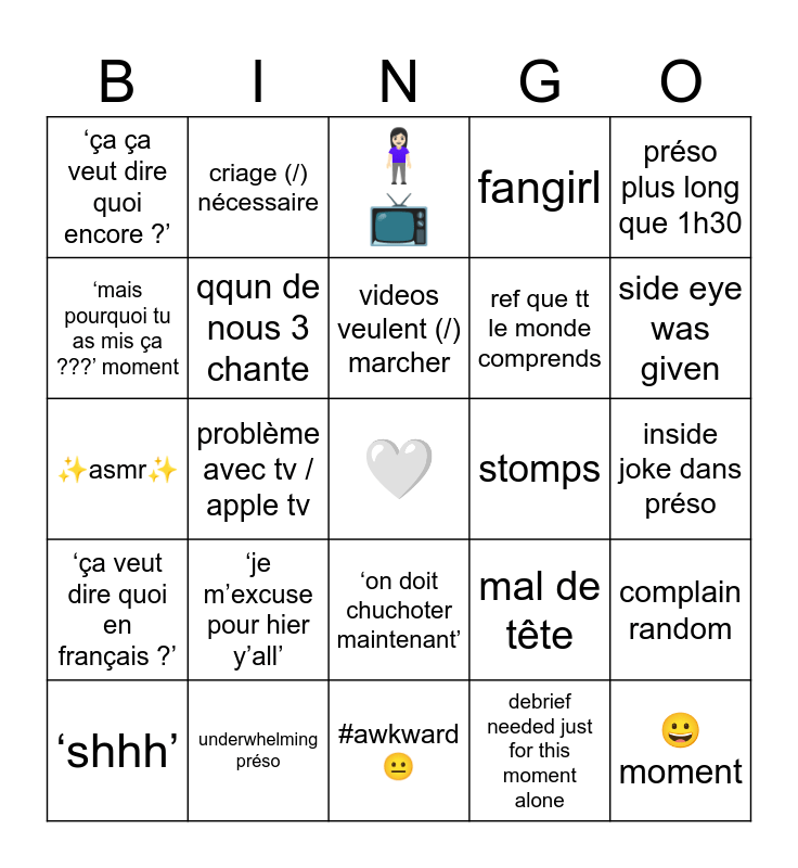 This bingo card has a free space and 24 words: ‘je m’excuse pour hier y’all’, underwhelming préso, videos veulent (/) marcher, ‘shhh’, préso plus long que 1h30, ‘ça ça veut dire quoi encore ?’, ‘mais pourquoi tu as mis ça ???’ moment, criage (/) nécessaire, stomps, ‘on doit chuchoter maintenant’, ref que tt le monde comprends, ✨asmr✨, mal de tête, complain random, qqun de nous 3 chante, debrief needed just for this moment alone, inside joke dans préso, 🧍🏻♀️📺, side eye was given, problème avec tv / apple tv, 😀moment, ‘ça veut dire quoi en français ?’, fangirl and #awkward 😐.