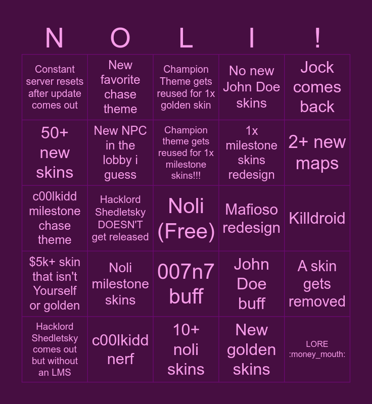 This bingo card has a free space and 24 words: Noli milestone skins, c00lkidd nerf, Champion theme gets reused for 1x milestone skins!!!, Hacklord Shedletsky comes out but without an LMS, Jock comes back, Constant server resets after update comes out, 50+ new skins, New favorite chase theme, Mafioso redesign, 007n7 buff, 1x milestone skins redesign, c00lkidd milestone chase theme, John Doe buff, A skin gets removed, New NPC in the lobby i guess, New golden skins, Killdroid, Champion Theme gets reused for 1x golden skin, 2+ new maps, Hacklord Shedletsky DOESN'T get released, LORE :money_mouth:, $5k+ skin that isn't Yourself or golden, No new John Doe skins and 10+ noli skins.