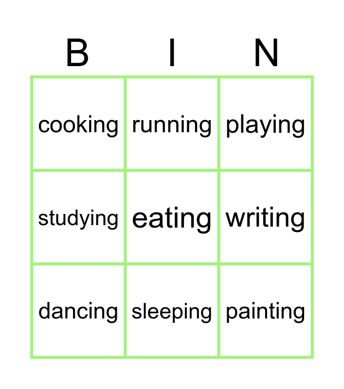 This bingo card has 22 words: reading, playing, running, swimming, writing, dancing, cooking, playing, singing, travelling, painting, studying, laughing, shopping, listening, working, cleaning, watching, learning, eating, sleeping and drinking.