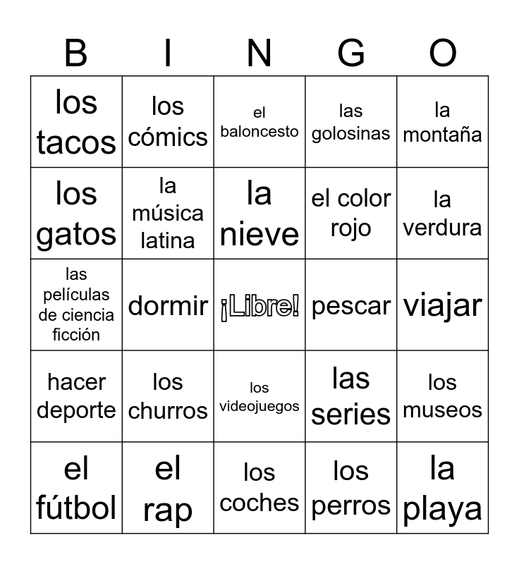 This bingo card has a free space and 29 words: el fútbol, el color verde, dormir, leer, los tacos, el baloncesto, la música latina, los churros, pescar, el rap, viajar, la playa, los coches, los perros, la verdura, el color azul, los videojuegos, hacer deporte, la montaña, las películas de ciencia ficción, las series, el queso, el color rojo, los gatos, las golosinas, los cómics, los museos, la nieve and la paella.
