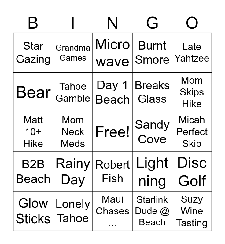 This bingo card has a free space and 24 words: Rainy Day, Lonely Tahoe, Day 1 Beach, Glow Sticks, Late Yahtzee, Star Gazing, Bear, Grandma Games, Sandy Cove, Robert Fish, Breaks Glass, Matt 10+ Hike, Light ning, Disc Golf, Tahoe Gamble, Starlink Dude @ Beach, Micah Perfect Skip, Micro wave, Mom Skips Hike, Mom Neck Meds, Suzy Wine Tasting, B2B Beach, Burnt Smore and Maui Chases ….