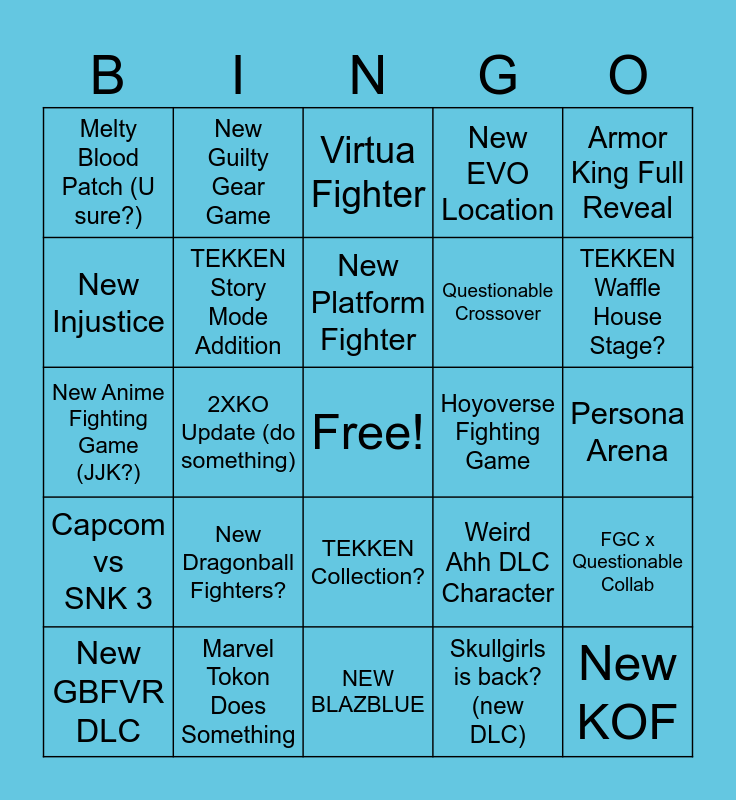 This bingo card has a free space and 24 words: New Dragonball Fighters?, Marvel Tokon Does Something, New Platform Fighter, New GBFVR DLC, Armor King Full Reveal, Melty Blood Patch (U sure?), New Injustice, New Guilty Gear Game, Hoyoverse Fighting Game, TEKKEN Collection?, Questionable Crossover, New Anime Fighting Game (JJK?), Weird Ahh DLC Character, FGC x Questionable Collab, TEKKEN Story Mode Addition, Skullgirls is back? (new DLC), Persona Arena, Virtua Fighter, TEKKEN Waffle House Stage?, 2XKO Update (do something), New KOF, Capcom vs SNK 3, New EVO Location and NEW BLAZBLUE.