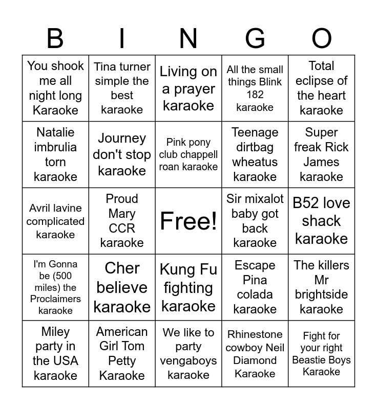 This bingo card has a free space and 25 words: Cher believe karaoke, We like to party vengaboys karaoke, Pink pony club chappell roan karaoke, Miley party in the USA karaoke, Total eclipse of the heart karaoke, You shook me all night long Karaoke, Natalie imbrulia torn karaoke, Tina turner simple the best karaoke, Sir mixalot baby got back karaoke, Kung Fu fighting karaoke, Teenage dirtbag wheatus karaoke, Avril lavine complicated karaoke, Escape Pina colada karaoke, The killers Mr brightside karaoke, Journey don't stop karaoke, Life is a highway Tom cockraine karaoke, B52 love shack karaoke, Living on a prayer karaoke, Super freak Rick James karaoke, Proud Mary CCR karaoke, Fight for your right Beastie Boys Karaoke, American Girl Tom Petty Karaoke, I'm Gonna be (500 miles) the Proclaimers karaoke, All the small things Blink 182 karaoke and Rhinestone cowboy Neil Diamond Karaoke.
