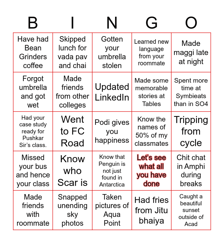 This bingo card has 25 words: Know who Scar is, Taken pictures of Aqua Point, Updated LinkedIn, Made friends with roommate, Made maggi late at night, Have had Bean Grinders coffee, Forgot umbrella and got wet, Skipped lunch for vada pav and chai, Know the names of 50% of my classmates, Know that Penguin is not just found in Antarctica, Made some memorable stories at Tables, Had your case study ready for Pushkar Sir’s class., Let’s see what all you have done, Chit chat in Amphi during breaks, Made friends from other colleges, Caught a beautiful sunset outside of Acad, Tripping from cycle, Gotten your umbrella stolen, Spent more time at Symbieats than in SO4, Went to FC Road, Podi gives you happiness, Snapped unending sky photos, Missed your bus and hence your class, Learned new language from your roommate and Had fries from Jitu bhaiya.