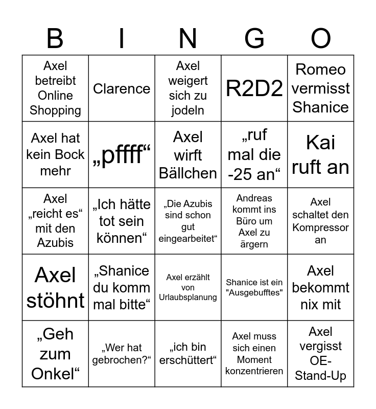 This bingo card has 41 words: Free!, Axel stöhnt, Axel haut Azubis mit Gegenständen, Axel wirft Bällchen, Axel muss sich einen Moment konzentrieren, Axel bekommt nix mit, Axel „reicht es“ mit den Azubis, Axel geht bald in Rente, Axel weigert sich zu jodeln, Andreas kommt ins Büro um Axel zu ärgern, Kai ruft an, Axel hat kein Bock mehr, „pffff“, „ich bin erschüttert“, „ruf mal die -25 an“, Axel schaltet den Kompressor an, „ordinär“, Clarence, Pimperlie, R2D2, Axel vergisst OE- Stand-Up, „Wie war das denn mit dem Teams?“, „Shanice du komm mal bitte“, „Die Azubis sind schon gut eingearbeitet“, Axels PC / Monitore spinnen, „Wo ist die verfickte Maus?“, „Geh zum Onkel“, Axel lässt das Rohrstöckchen tanzen, Axel erzählt von Urlaubsplanung, Axel will Martin das Zöpfchen abschneiden, Axel beschwert sich über Toilettensituation, Axel betreibt Online Shopping, „Ich hätte tot sein können“, Maria isst Nudeln mit Pesto, Shanice ist ein "Ausgebufftes", Romeo vermisst Shanice, Axel macht Joachims "Morgeeeeeen" nach, „Wer hat gebrochen?“, 🎶Elberling Elberling, Nette Menschen trinken einen Elberling🎶, „Ihhhh“ and Axel will Kleidung von Azubis aufschneiden.