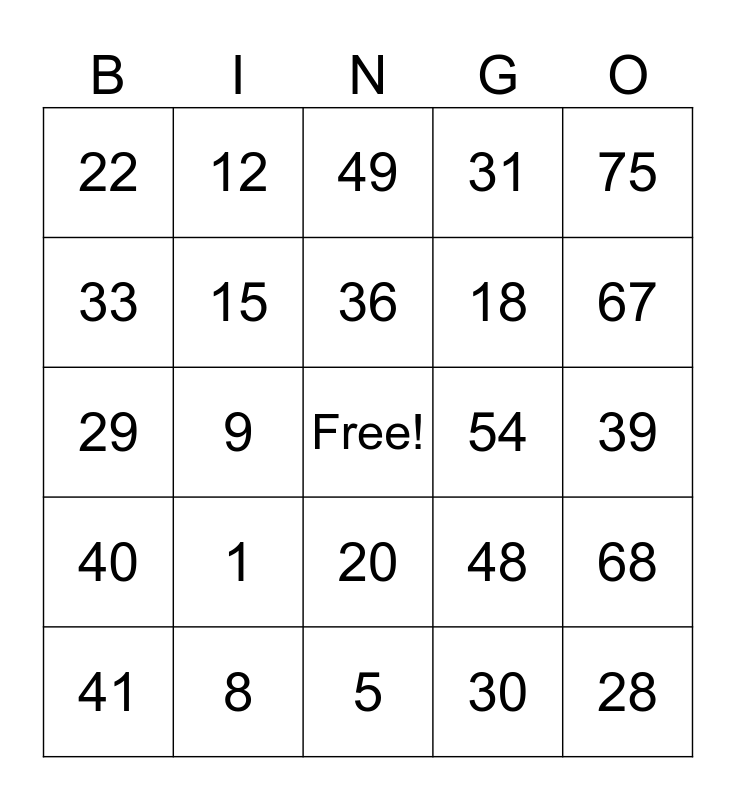 This bingo card has a free space and 24 words: 1, 8, 36, 41, 75, 22, 33, 12, 54, 20, 18, 29, 48, 68, 15, 30, 39, 49, 67, 9, 28, 40, 31 and 5.