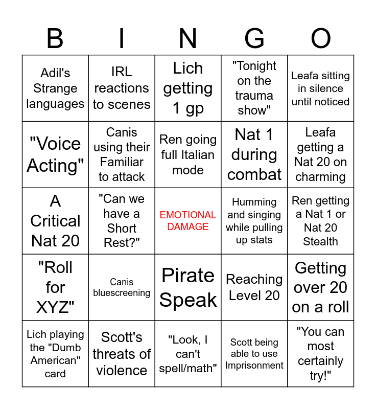 This bingo card has a free space and 24 words: Canis bluescreening, Scott's threats of violence, Ren going full Italian mode, Lich playing the "Dumb American" card, Leafa sitting in silence until noticed, Adil's Strange languages, "Voice Acting", IRL reactions to scenes, Humming and singing while pulling up stats, Pirate Speak, Nat 1 during combat, A Critical Nat 20, Reaching Level 20, Getting over 20 on a roll, Canis using their Familiar to attack, Scott being able to use Imprisonment, Ren getting a Nat 1 or Nat 20 Stealth, Lich getting 1 gp, Leafa getting a Nat 20 on charming, "Can we have a Short Rest?", "You can most certainly try!", "Roll for XYZ", "Tonight on the trauma show" and "Look, I can't spell/math".