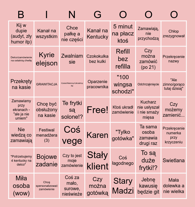 This bingo card has a free space and 48 words: Coś łagodnego, Czy można zamówić (po 21), Czy można gotówką, Chcę być obsłużony na kasie, Czesi/Niemcy/Ukraińcy itp, Czy możemy zamienić..., Kanał na wszystkim, Chcę spersonalizować zamówienie, Zamawiają, nie przychodzą, Karen, Chłop zrezygnował, Kanał na Kentucky, Odchrząknięcie, "100 wingsa schodzi", "Potrzebujemy 4 kentucky na delco", Kucharz nie usłyszał i nie smaży mięsa, Delco/zamówienie na ostatnią chwilę, Przekręcenie nazwy, To są duże frytki!?, 5 minut na płacz ktoś, Refill bez refilla, Te frytki są solone!?, Kij w dupie (audyt, zły humor itp), Kyrie elejson, Swietlana, Zwalniam sie, "Ale zimno/gorąco tutaj dzisiaj", Miła osoba (wow), Oparzenie pracownika, GRAWITACJA, Jebnę kawusię będzie git, Ktoś ukradł zamówienie, Przekręcenie numerka przy krzyczeniu, Bojowe zadanie, Zamawiamy przy ekranach - "ale ja nie umiem", "Tylko gotówka", Ta sama osoba zamawia drugi raz, Przekręty na kasie, Coś vege, Czy to jest moje zamówienie, Nie wiedzą co zamawiają, Mała dolewka a nie wielka, Chce pałkę a nie części, Coś za mało, surowe, nieświeże, Czokokulka bez kulki, Stały klient, Festiwal menadżera (3) and Stary Madzi.