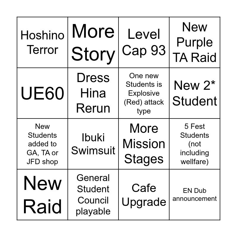 This bingo card has 16 words: General Student Council playable, 5 Fest Students (not including wellfare), Level Cap 93, Hoshino Terror, New Students added to GA, TA or JFD shop, More Story, More Mission Stages, Cafe Upgrade, UE60, Dress Hina Rerun, New Raid, New Purple TA Raid, Ibuki Swimsuit, New 2* Student, One new Students is Explosive (Red) attack type and EN Dub announcement.