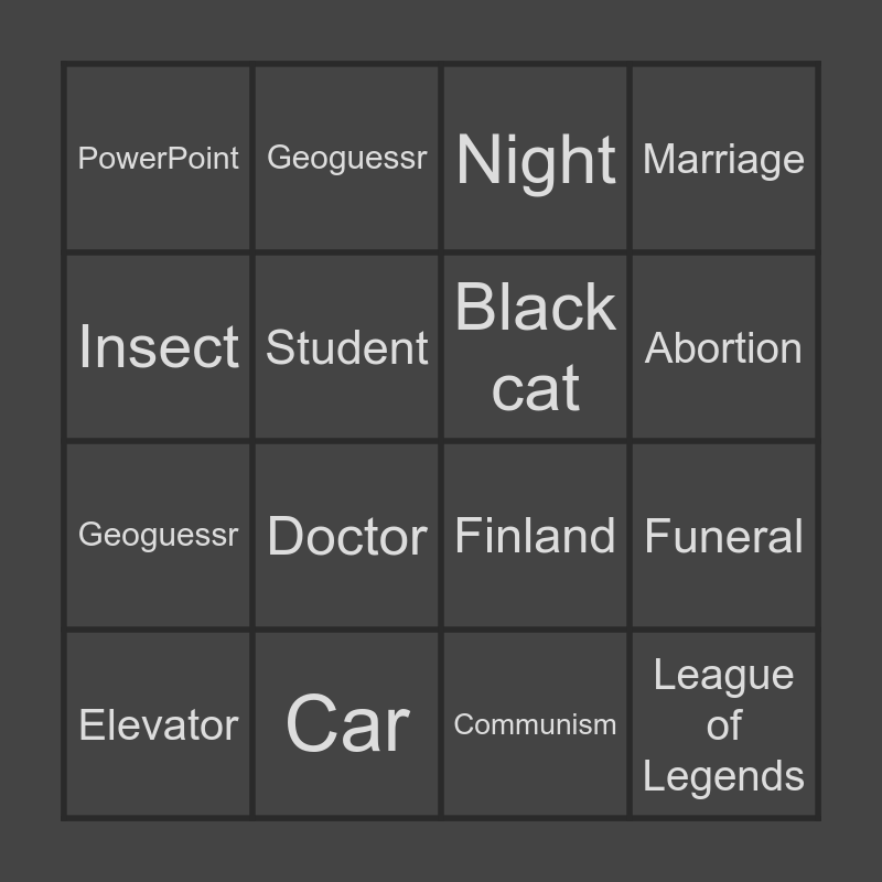 This bingo card has 20 words: Funeral, Supermarket, Night, Lab, Elevator, Insect, Car, PowerPoint, Geoguessr, Geoguessr, Doctor, Finland, Student, League of Legends, Black cat, Pizza, Abortion, Marriage, Communism and Clown.