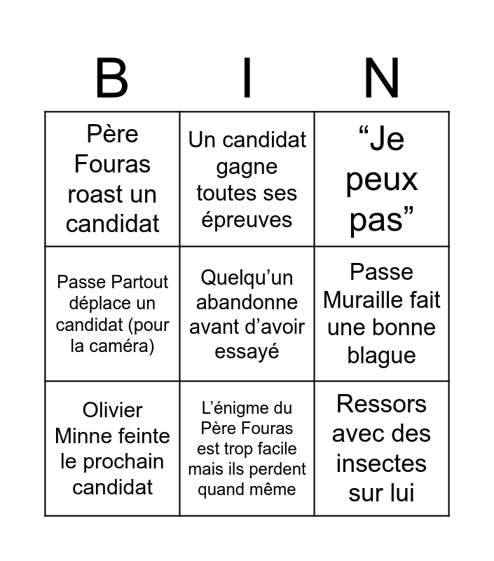 This bingo card has a free space and 8 words: Passe Muraille fait une bonne blague, “Je peux pas”, Un candidat gagne toutes ses épreuves, Olivier Minne feinte le prochain candidat, Père Fouras roast un candidat, Ressors avec des insectes sur lui, Passe Partout déplace un candidat (pour la caméra) and L’énigme du Père Fouras est trop facile mais ils perdent quand même.