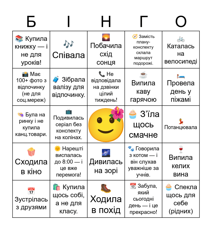 This bingo card has a free space and 24 words: 🌞 Нарешті виспалась до 8:00 — і це вже перемога!, 🛍️ Купила щось собі, а не для класу., 📞 Не відповідала на дзвінки цілий тиждень!, 📅 Зустрілась з друзями, 🚲 Каталась на велосипеді, 📚 Купила книжку — і не для уроків!, 📸 Має 100+ фото з відпочинку (не для соц.мереж), 🎶 Співала, 🧁 З’їла щось смачне, 🌌 Дивилась на зорі, ☕ Випила каву гарячою, 👒 Була на ринку і не купила канц.товари., 🐾 Говорила з котом — і він слухав уважніше за учнів., 🍷 Випила келих вина, 🧳 Зібрала валізу для відпочинку., 📆 Забула, який сьогодні день — і це прекрасно!, 💃 Потанцювала, 🌄 Побачила схід сонця, 🛏️ Провела день у піжамі, 📺 Подивилась серіал без конспекту на колінах., 🧁 Спекла щось для себе (рідних), 🍿 Сходила в кіно, 🧭 Замість плану-конспекту склала маршрут подорожі. and 🥾 Ходила в похід.