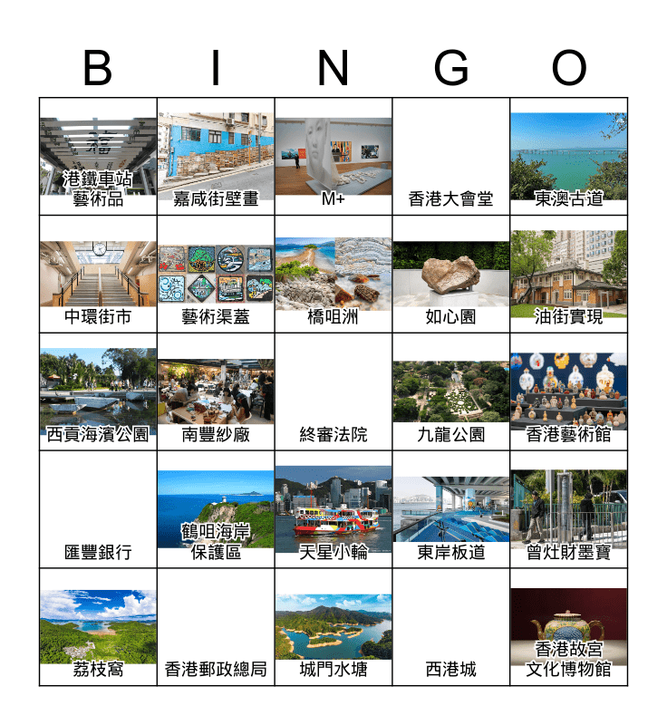 This bingo card has 20 images and 25 words: 鶴咀海岸 保護區, 城門水塘, 橋咀洲, 荔枝窩, 東澳古道, 港鐵車站 藝術品, 中環街市, 嘉咸街壁畫, 九龍公園, 天星小輪, 如心園, 西貢海濱公園, 東岸板道, 曾灶財墨寶, 藝術渠蓋, 香港故宮 文化博物館, 香港藝術館, M+, 油街實現, 南豐紗廠, 終審法院, 香港郵政總局, 匯豐銀行, 香港大會堂 and 西港城.