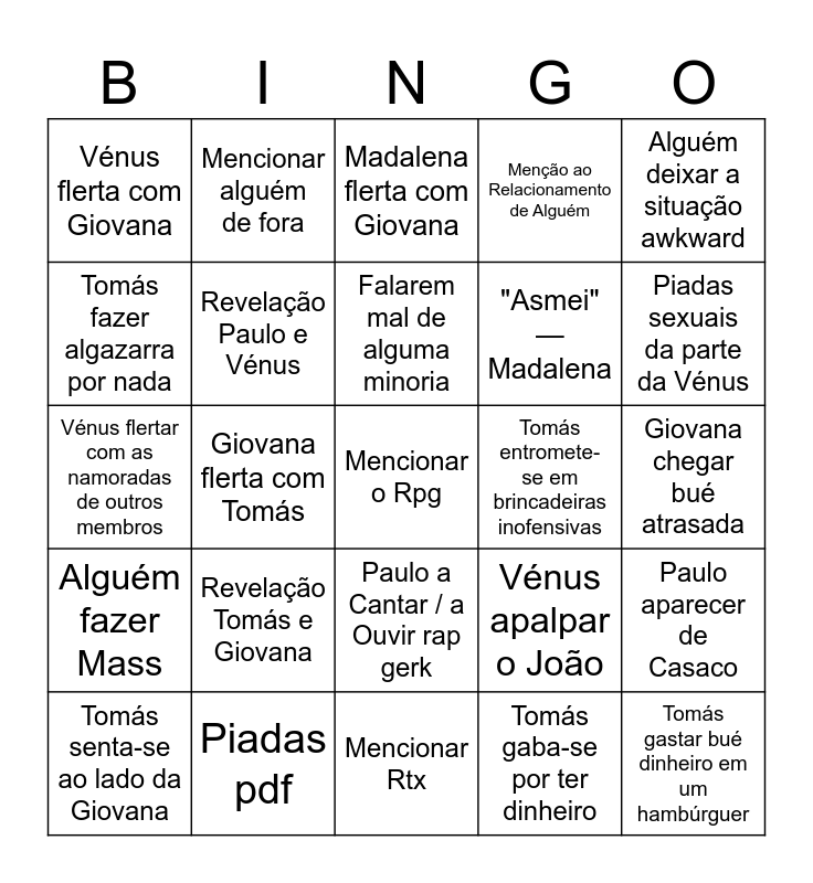 This bingo card has a free space and 29 words: Tomás senta-se ao lado da Giovana, Tomás senta-se ao lado da Madalena, Giovana flerta com Tomás, Tomás Flerta com Giovana, Vénus flerta com Giovana, Madalena flerta com Giovana, Revelação Paulo e Vénus, Revelação Tomás e Giovana, Tomás entromete-se em brincadeiras inofensivas, Piadas pdf, Giovana chegar bué atrasada, Tomás gastar bué dinheiro em um hambúrguer, Mencionar Rtx, Tomás gaba-se por ter dinheiro, Piadas sexuais da parte da Vénus, Paulo aparecer, Paulo a Cantar / a Ouvir rap gerk, Alguém fazer Mass, Alguém deixar a situação awkward, Vénus flertar com as namoradas de outros membros, Vénus apalpar o João, Madalena Abusar de Alguém, "Asmei" — Madalena, Tomás fazer algazarra por nada, Menção ao Relacionamento de Alguém, Mencionar alguém de fora, Paulo aparecer de Casaco, Falarem mal de alguma minoria and Alguém sair Chateado.