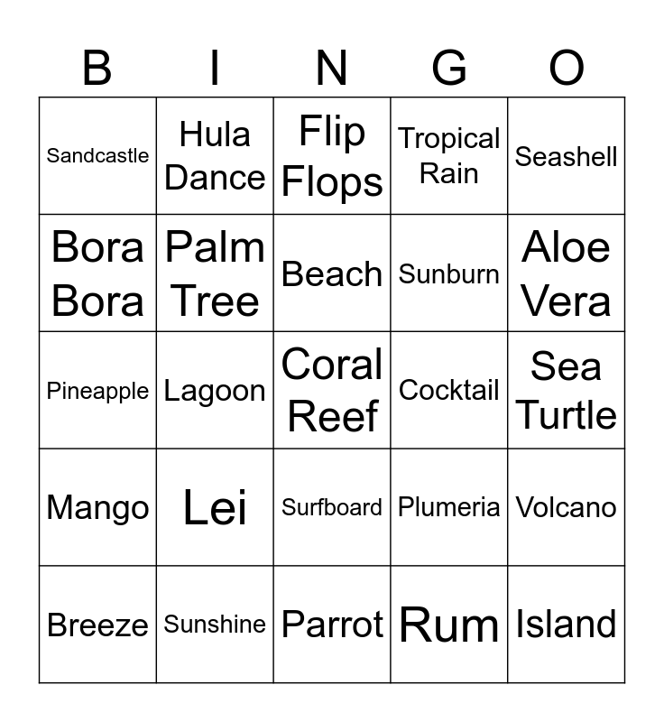This bingo card has 41 words: Free!, Pineapple, Coconut, Palm Tree, Sunshine, Surfboard, Beach, Hammock, Seashell, Mango, Lagoon, Tropical Rain, Coral Reef, Sea Turtle, Cocktail, Lei, Banana, Sandcastle, Snorkel, Flip Flops, Volcano, Island, Parrot, Sunburn, Wave, Crab, Rum, Daiquiri, Aloe Vera, Seagull, Tiki Torch, Hula Dance, Breeze, Frangipani, Plumeria, Bora Bora, Fiji, Maldives, Hawaii, Caribbean and Tahiti.