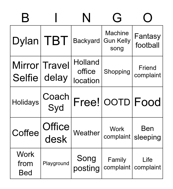 This bingo card has a free space and 29 words: Work from Bed, Tony the cat, Coach Syd, Bennett, Dylan, Backyard, Travel delay, Office desk, OOTD, Playground, Food, Life complaint, Song posting, Family complaint, Friend complaint, Deleted story, Weather, Coffee, Fantasy football, Holidays, Work complaint, Landscape, Shopping, Mirror Selfie, Machine Gun Kelly song, TBT, Ben sleeping, Holland office location and Ladybug.