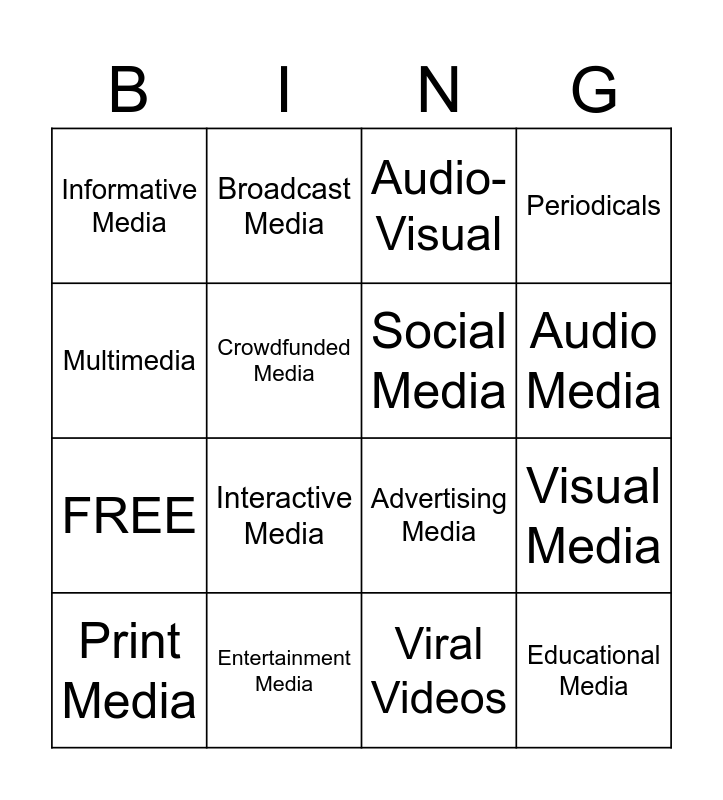 This bingo card has 19 words: Print Media, Digital Media, Audio-Visual, Visual Media, News Media, Broadcast Media, Viral Videos, Periodicals, Informative Media, Interactive Media, Social Media, Audio Media, FREE, Entertainment Media, Advertising Media, Educational Media, Multimedia, Crowdfunded Media and Graphic Media.