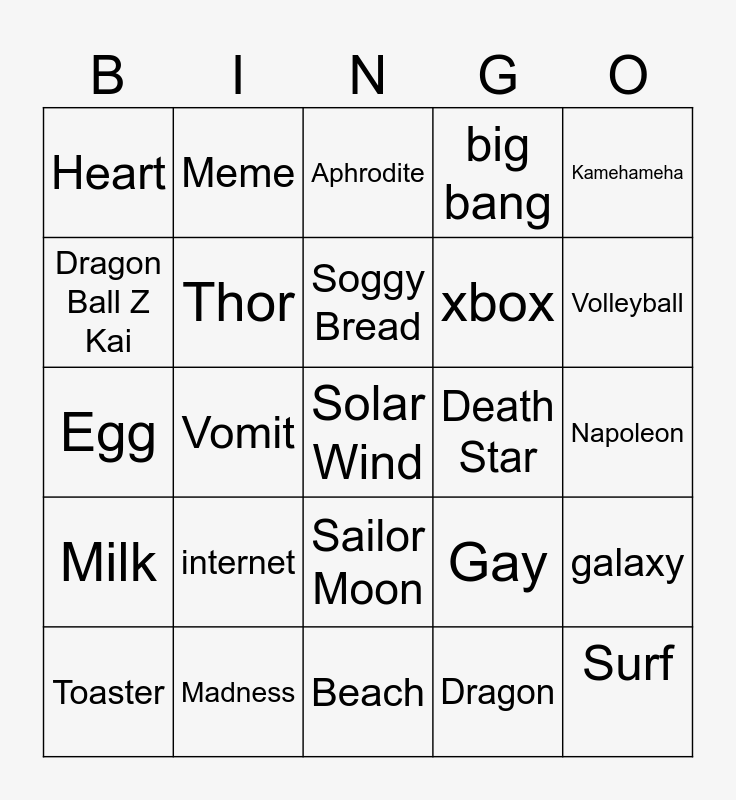 This bingo card has 25 words: internet, Beach, Soggy Bread, Toaster, Kamehameha, Heart, Dragon Ball Z Kai, Meme, Death Star, Sailor Moon, xbox, Egg, Gay, galaxy, Thor, Surf, Napoleon, Aphrodite, Volleyball, Vomit, Solar Wind, Madness, Milk, big bang and Dragon.