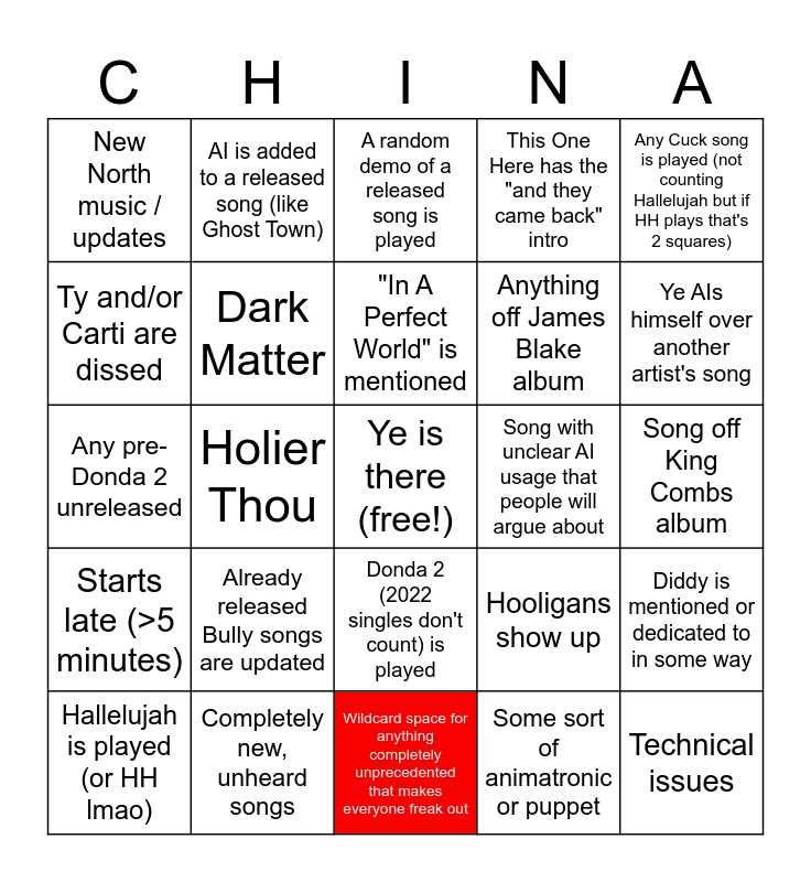 This bingo card has a free space and 24 words: Already released Bully songs are updated, Completely new, unheard songs, "In A Perfect World" is mentioned, Hallelujah is played (or HH lmao), Any Cuck song is played (not counting Hallelujah but if HH plays that's 2 squares), New North music / updates, Ty and/or Carti are dissed, AI is added to a released song (like Ghost Town), Song with unclear AI usage that people will argue about, Donda 2 (2022 singles don't count) is played, Anything off James Blake album, Any pre-Donda 2 unreleased, Hooligans show up, Diddy is mentioned or dedicated to in some way, Dark Matter, Some sort of animatronic or puppet, Song off King Combs album, A random demo of a released song is played, Ye AIs himself over another artist's song, Holier Thou, Technical issues, Starts late (>5 minutes), This One Here has the "and they came back" intro and Wildcard space for anything completely unprecedented that makes everyone freak out.