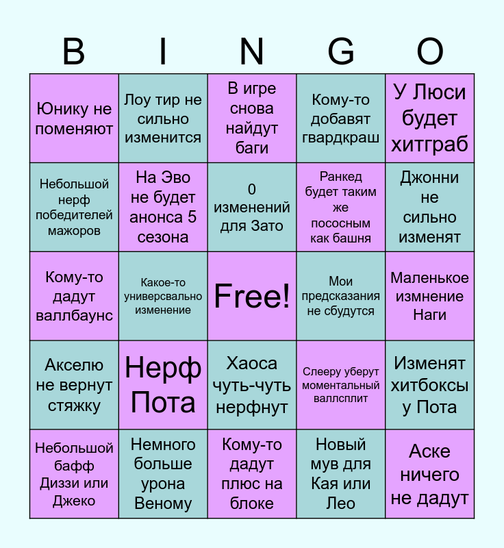 This bingo card has a free space and 24 words: Нерф Пота, Немного больше урона Веному, 0 изменений для Зато, Небольшой бафф Диззи или Джеко, У Люси будет хитграб, Юнику не поменяют, Небольшой нерф победителей мажоров, Лоу тир не сильно изменится, Мои предсказания не сбудутся, Хаоса чуть-чуть нерфнут, Ранкед будет таким же пососным как башня, Кому-то дадут валлбаунс, Слееру уберут моментальный валлсплит, Изменят хитбоксы у Пота, На Эво не будет анонса 5 сезона, Новый мув для Кая или Лео, Маленькое измнение Наги, В игре снова найдут баги, Джонни не сильно изменят, Какое-то универсвально изменение, Аске ничего не дадут, Акселю не вернут стяжку, Кому-то добавят гвардкраш and Кому-то дадут плюс на блоке.