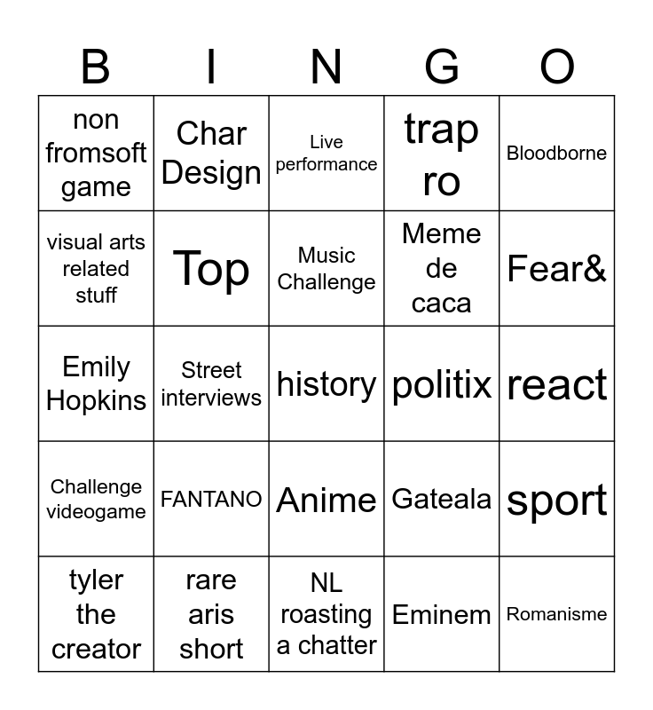 This bingo card has 25 words: FANTANO, NL roasting a chatter, Music Challenge, tyler the creator, Bloodborne, non fromsoft game, visual arts related stuff, Char Design, politix, Anime, Meme de caca, Emily Hopkins, Gateala, sport, Top, Romanisme, react, Live performance, Fear&, Street interviews, history, rare aris short, Challenge videogame, trap ro and Eminem.