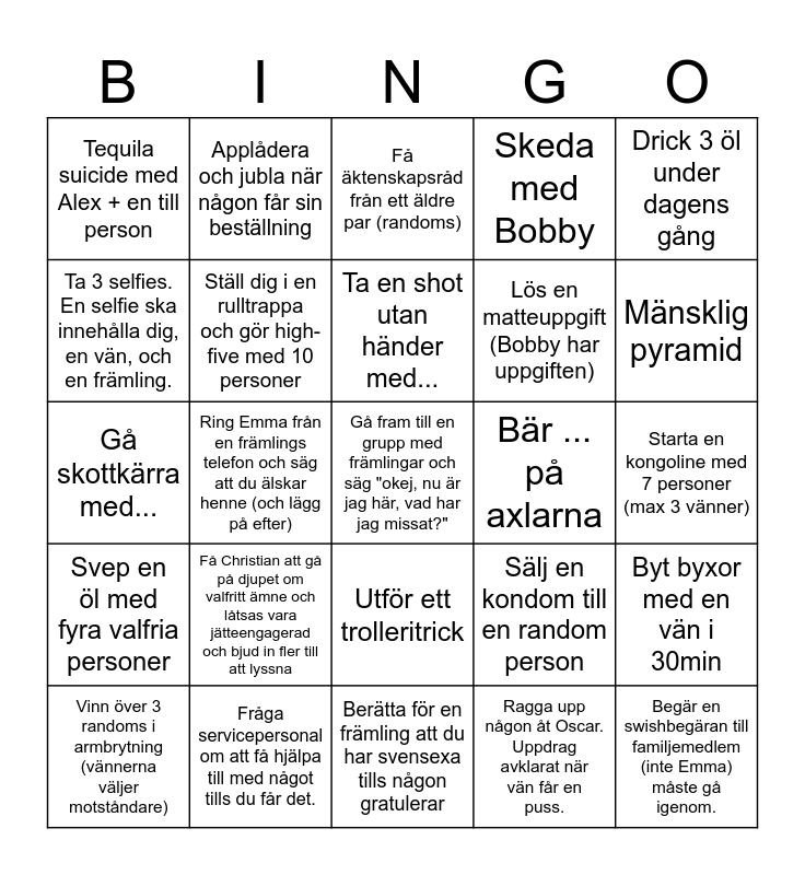 This bingo card has 25 words: Få Christian att gå på djupet om valfritt ämne och låtsas vara jätteengagerad och bjud in fler till att lyssna, Berätta för en främling att du har svensexa tills någon gratulerar, Ta en shot utan händer med..., Vinn över 3 randoms i armbrytning (vännerna väljer motståndare), Drick 3 öl under dagens gång, Tequila suicide med Alex + en till person, Ta 3 selfies. En selfie ska innehålla dig, en vän, och en främling., Applådera och jubla när någon får sin beställning, Bär ... på axlarna, Utför ett trolleritrick, Lös en matteuppgift (Bobby har uppgiften), Gå skottkärra med..., Sälj en kondom till en random person, Byt byxor med en vän i 30min, Ställ dig i en rulltrappa och gör high-five med 10 personer, Begär en swishbegäran till familjemedlem (inte Emma) måste gå igenom., Starta en kongoline med 7 personer (max 3 vänner), Få äktenskapsråd från ett äldre par (randoms), Mänsklig pyramid, Ring Emma från en främlings telefon och säg att du älskar henne (och lägg på efter), Gå fram till en grupp med främlingar och säg "okej, nu är jag här, vad har jag missat?", Fråga servicepersonal om att få hjälpa till med något tills du får det., Svep en öl med fyra valfria personer, Skeda med Bobby and Ragga upp någon åt Oscar. Uppdrag avklarat när vän får en puss..