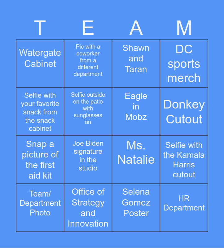 This bingo card has 18 words: Joe Biden signature in the studio, HR Department, Shawn and Taran, Watergate Cabinet, Ms. Natalie, DC sports merch, Team/ Department Photo, Pic with a coworker from a different department, Donkey Cutout, Snap a picture of the first aid kit, Selena Gomez Poster, Selfie with your favorite snack from the snack cabinet, Selfie with the Kamala Harris cutout, Selfie outside on the patio with sunglasses on, Eagle in Mobz, The Chair's Poster, Office of Strategy and Innovation and First Aide Kit.