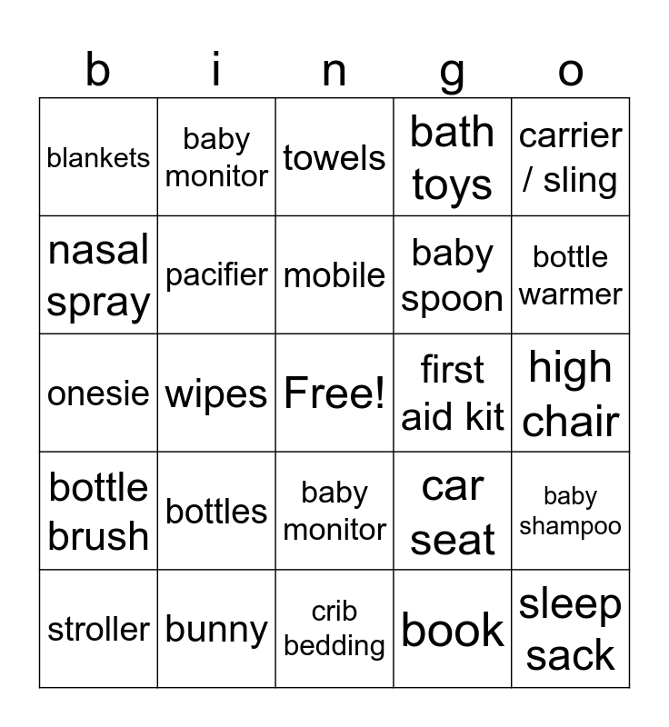 This bingo card has a free space and 29 words: stroller, diapers, wipes, teddy beart, blankets, towels, pacifier, bottles, first aid kit, bunny, high chair, sleep sack, crib bedding, book, bottle warmer, baby shoes, baby monitor, bottle brush, carrier / sling, onesie, car seat, rattle, baby spoon, nasal spray, bath toys, baby monitor, baby shampoo, mobile and swaddle banket.
