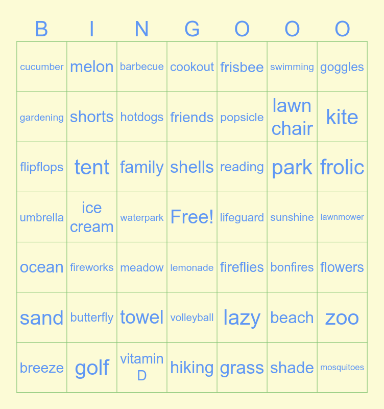 This bingo card has a free space and 80 words: baseball, butterfly, barbecue, beach, berries, swimsuit, flowers, boating, bonfires, breeze, sunshine, camping, cookout, cucumber, crickets, swimming, fireworks, family, fishing, flipflops, fireflies, frisbee, friends, gardening, goggles, grass, golf, hiking, hamburgers, hammock, hotdogs, humidity, ice cream, mosquitoes, frolic, kite, ladybug, lake, lemonade, lawn chair, lifeguard, lazy, s'more, marshmallow, meadow, melon, lawnmower, ocean, patio, peaches, park, popsicle, reading, relax, road trip, roller coaster, sand, sea, shade, shells, shorts, sprinkler, sunscreen, surfing, tan, tennis, thunderstorm, tomatoes, towel, trampoline, tent, umbrella, vacation, vitamin D, volleyball, waves, waterpark, yard sales, zoo and cruise.