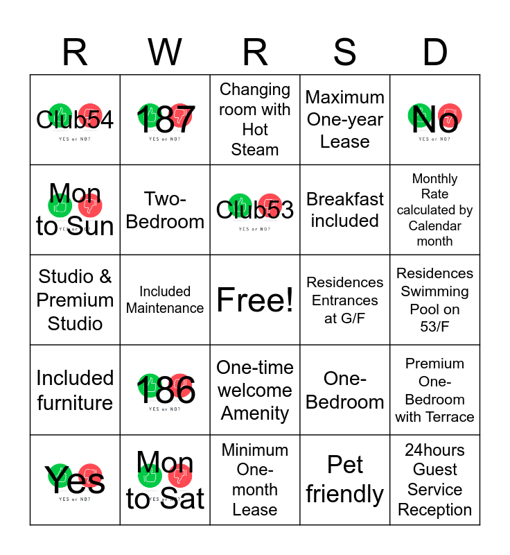 This bingo card has 8 images, a free space and 24 words: 186, Mon to Sat, Club53, Yes, No, Club54, Mon to Sun, 187, Residences Entrances at G/F, One-time welcome Amenity, Breakfast included, Studio & Premium Studio, One-Bedroom, Premium One-Bedroom with Terrace, Two-Bedroom, Pet friendly, Residences Swimming Pool on 53/F, Changing room with Hot Steam, Monthly Rate calculated by Calendar month, Included Maintenance, 24hours Guest Service Reception, Included furniture, Maximum One-year Lease and Minimum One-month Lease.