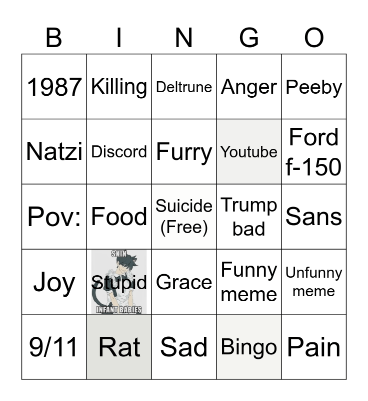 This bingo card has 1 images, a free space and 24 words: Stupid, Rat, Furry, 9/11, Peeby, 1987, Natzi, Killing, Trump bad, Grace, Youtube, Pov:, Funny meme, Unfunny meme, Discord, Bingo, Sans, Deltrune, Ford f-150, Food, Pain, Joy, Anger and Sad.