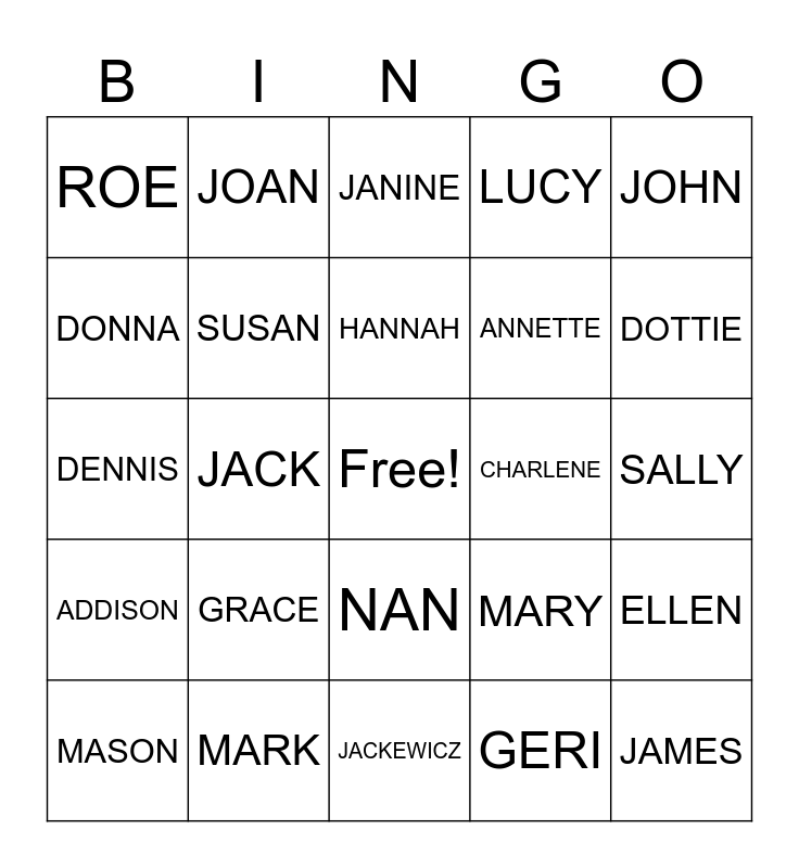 This bingo card has a free space and 24 words: GRACE, MARK, HANNAH, MASON, JOHN, ROE, DONNA, JOAN, CHARLENE, NAN, ANNETTE, DENNIS, MARY, ELLEN, SUSAN, GERI, SALLY, JANINE, DOTTIE, JACK, JAMES, ADDISON, LUCY and JACKEWICZ.