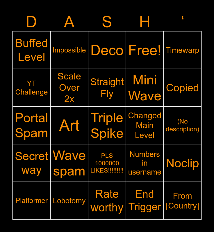 This bingo card has a free space and 24 words: Wave spam, Lobotomy, Straight Fly, Platformer, Timewarp, Buffed Level, YT Challenge, Impossible, Changed Main Level, PLS 1000000 LIKES!!!!!!!!!, Mini Wave, Portal Spam, Numbers in username, Noclip, Scale Over 2x, End Trigger, (No description), Deco, Copied, Art, From [Country], Secret way, Free! and Rate worthy.