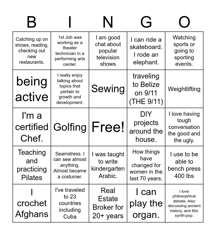 This bingo card has a free space and 97 words: Running, jewelry making, crafts, Gardening, Reading, Golfing, Gardening, hiking, Growing food, Running, traveling, jewelry making, crafts, baking, Playing video games, Video Games, walks, listening to music, being with friends and family, and just being outside., Gardening, yoga, reading recipes, and wander (long walks)., Reading, video games, baking, Triathlons, Teaching and practicing Pilates, Motorcycling through various parts of regional Americana in the USA., Catching up on shows, reading, checking out new restaurants., Watching sports or going to sporting events., Biking, Singing karaoke at a place where I can also play pool., Reading, Gardening, Mountain Biking, skiing, reading, and getting my kids to do or try the same., Soccer, Video games and trading card games., Modern board games, tennis, watching ice hockey., Working out, Sewing, I crochet Afghans, I use to be able to bench press 400 lbs, I can ride water buffalos bareback, Not using any device, I can call someone a mile away, I really enjoy talking about topics that pertain to growth and development., I can ride a skateboard. I rode an elephant., I'm pretty decent at archery., I was sponsored by a company called Daily Driven and was super into JDM cars., Real Estate Broker for 20+ years, I was taught to write kindergarten Arabic., Singing, uncanny sense of direction, I've formally learned (and yet am not fluent in ^.^) 4 different languages, I'm a certified Chef., I love to cook., I love having tough conversation the good and the ugly., Juggling, I can play the organ., Seamstress. I can sew almost anything. Almost became a costumer., I was a really fast whiz on morse code as a ham radio operator., Swing Dancing, I'm a really good swimmer, my wife can juggle, I love to sing and can sing, I have completed 6 marathons, Never been to Europe, I was born at Ballard Hospital (now Swedish), I've jumped out of an airplane alone with a parachute., As a member of a dance troupe in high school, traveling, I ran 6 marathons, 1st Job was working as a theater technician in a performing arts center., I have a SXS razor that I go out on the sand dunes with, 3 years ago, I went Skydiving, Scuba diving in Borneo amongst sharks, and barracudas, Studied abroad during college in Vienna, and Austria, scuba dived with a bunch of sharks at the Maui aquarium., I have a cameo in a YouTube video with 8.8M views, Attended a polygamist wedding in Colorado City, I performed as a dancer in the Statue of Liberty, I went skydiving in 2012 before my 30th birthday., Swam with sharks and sting rays in Belize, I've represented the U.S. in Chile in a mixed-doubles gymnastics competition., I've traveled to 23 countries including Cuba, traveling to Belize on 9/11 (THE 9/11), Living in a three generation household., I was once trapped underwater with my foot pinned under a rock., I went to Iceland for my honeymoon, that was fun., I ran into one of my favorite social media influences back in April in Downtown Disney, Running, Grand strategy games, The history of PeopleSoft at King County, DIY projects around the house., food, Running and dogs., Weightlifting, Anything computer science related, I am really passionate about helping people in any way I can., Yoga - using it to heal the body, mind and spirit., Disney cruises, I love philosophical debate. Also discussing ancient history, and 80s synth-pop., Self-care, Traditional Okinawan Karate., Education Opportunities and Racial Justice issues., I am good chat about popular television shows, Professional Wrestling, Dance of all kinds (ballroom, salsa, swing, lyrical, contemporary, jazz, ballet, hip hop, musical theater), How things have changed for women in the last 70 years., being active, Backcountry Camping and Play "Soulsborn" series of games by From Software..