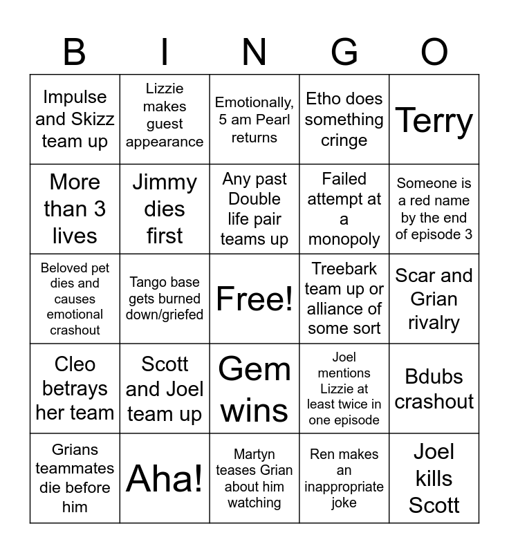 This bingo card has a free space and 24 words: Scott and Joel team up, Aha!, Any past Double life pair teams up, Grians teammates die before him, Terry, Impulse and Skizz team up, More than 3 lives, Lizzie makes guest appearance, Treebark team up or alliance of some sort, Gem wins, Failed attempt at a monopoly, Beloved pet dies and causes emotional crashout, Joel mentions Lizzie at least twice in one episode, Bdubs crashout, Jimmy dies first, Ren makes an inappropriate joke, Scar and Grian rivalry, Emotionally, 5 am Pearl returns, Someone is a red name by the end of episode 3, Tango base gets burned down/griefed, Joel kills Scott, Cleo betrays her team, Etho does something cringe and Martyn teases Grian about him watching.