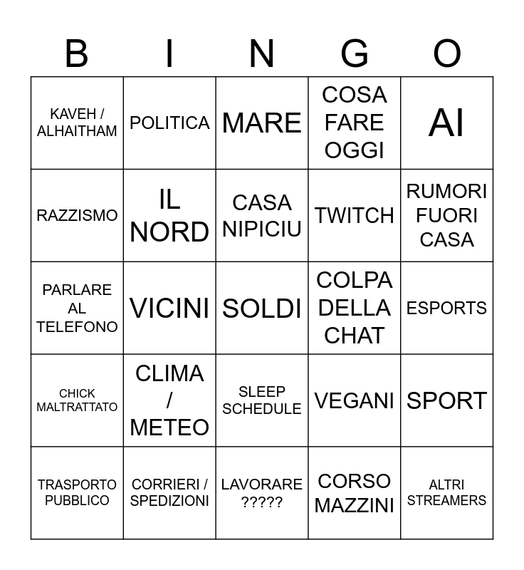 This bingo card has a free space and 24 words: CLIMA / METEO, CORRIERI / SPEDIZIONI, CASA NIPICIU, TRASPORTO PUBBLICO, AI, KAVEH / ALHAITHAM, RAZZISMO, POLITICA, COLPA DELLA CHAT, SLEEP SCHEDULE, TWITCH, PARLARE AL TELEFONO, VEGANI, SPORT, IL NORD, CORSO MAZZINI, ESPORTS, MARE, RUMORI FUORI CASA, VICINI, ALTRI STREAMERS, CHICK MALTRATTATO, COSA FARE OGGI and LAVORARE ?????.