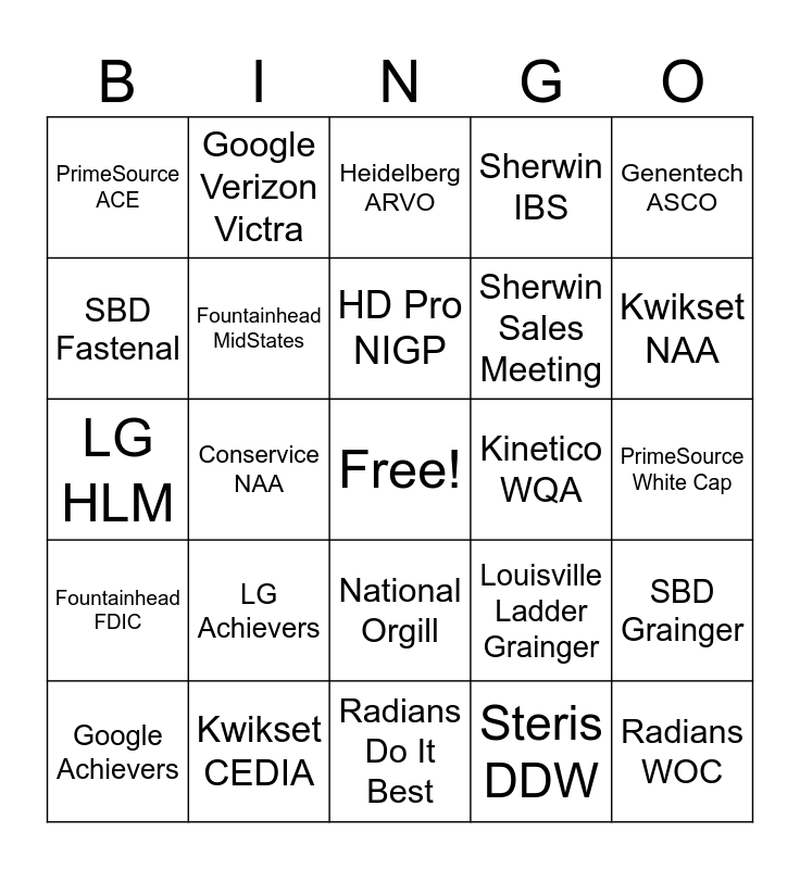 This bingo card has a free space and 33 words: Baldwin KBIS, BorgWarner ACT, Conservice NAA, Converge World of Concrete, Fountainhead FDIC, Fountainhead MidStates, Genentech ASCO, Google Achievers, Google Verizon Victra, HD Pro BOMA, HD Pro NIGP, Heidelberg ARVO, Ipsen ASCO, Ipsen AASLD, Kinetico WQA, Kwikset NAA, Kwikset CEDIA, LG HLM, LG Achievers, Louisville Ladder Grainger, National Orgill, National True Value, PrimeSource ACE, PrimeSource White Cap, Radians Do It Best, Radians WOC, Sherwin IBS, Sherwin Sales Meeting, SBD Fastenal, SBD Grainger, Steris ACG, Steris DDW and Volvo Skills USA.