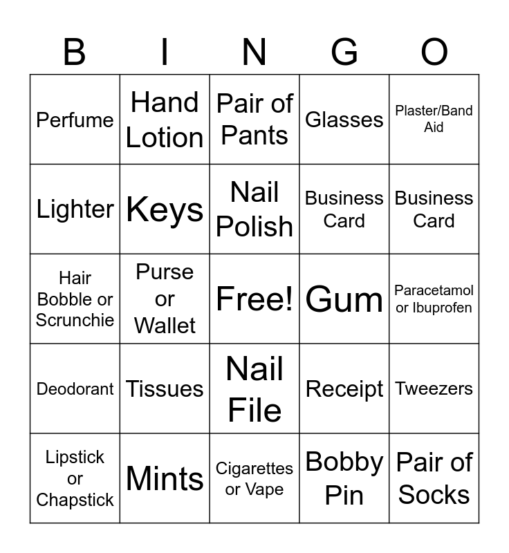 This bingo card has a free space and 29 words: Lipstick or Chapstick, Pen, Purse or Wallet, Tampon or Pad, Perfume, Pair of Pants, Keys, Tissues, Gum, Mints, Paracetamol or Ibuprofen, Pair of Socks, Cigarettes or Vape, Bobby Pin, Business Card, Sun Glasses, Nail File, Deodorant, Plaster/Band Aid, Hair Bobble or Scrunchie, Receipt, Hair Brush, Business Card, Lighter, Glasses, Hand Lotion, Tweezers, Nail Polish and Hand Sanitizer.