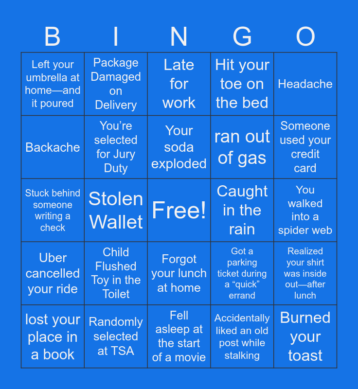 This bingo card has a free space and 107 words: Car Broke Down, Lost Your Job, Stolen Wallet, Broken Shoe Heel, Baby Vomit on your shirt, Missed the Bus, Missed the Train, Car splashed you with water, Broke a mirror, No Toilet Paper, Left Wallet at home, Lost- No GPS Signal, Wifi is Out, Broken phone screen, Lost cell phone, Flight Cancelled, Package Damaged on Delivery, Flat Tire, Car won’t start, Kids used crayon on the wall, Child Flushed Toy in the Toilet, Broke a Nail, Broken air conditioner, Caught a cold, Toothache, Headache, Backache, Hit your toe on the bed, Hit your elbow., Missed your flight, Luggage over 50 Pounds, Randomly selected at TSA, Lost your Money, Forgot where you put your glasses, Can’t find the remote control, Late for work, Lost at the casino, Didn’t win the lottery, Kids put gum in your hair, Burned your toast, Out of Chicken, Left at a cruise port, Fell asleep at the start of a movie, Your fish died, Dog chewed your shoes, You’re selected for Jury Duty, Left an item at the store you paid for, Your soda exploded, Stuck at a train crossing, Caught in the rain, Your power went out, Someone used your credit card, Uber cancelled your ride, Uber eats driver ate some of your food, Spilled coffee on your shirt before a meeting, Forgot your password and got locked out, Stepped in gum, Burned your mouth on hot pizza, Dropped your phone on your face, Left your umbrella at home—and it poured, Accidentally replied-all to an email, Got a paper cut from opening mail, Sat on something wet, Sneezed with a mouthful of food, Forgot to cancel a free trial and got charged, Ran out of shampoo mid-shower, Stuck in a group text you can’t mute, Realized your shirt was inside out—after lunch, Dropped your keys in a storm drain, Got a parking ticket during a “quick” errand, Forgot your lunch at home, Stuck behind someone writing a check, Accidentally liked an old post while stalking, Got a sunburn in a weird shape, Alarm didn’t go off, Left your phone charger at home, Got locked out of your house, Got stuck in an elevator, pen exploded in your pocket, Your zipper broke, Your shoelace snapped, You spilled something on your keyboard, got a splinter, dropped your food right after buying it, got stuck in traffic right before an interview, You forgot your headphones, There's a bug in your drink, parked in a tow away zone, got a call just as you entered a tunnel, left your laundry in the washer too long, ran out of gas, sunroof leak during a storm, flat bike tire, got a surprise bill, dropped your sandwich face-down, got a stain on your favorite shirt, lost your place in a book, got a voicemail with no callback number, You forgot your PIN at the ATM, Your computer has a long update as you signing on for work, You need to use a sick day for actually being sick, You go to pay, but they don’t accept tap, You waved back at someone who wasn’t actually waving at you, You open a bag of snacks and they explode everywhere, Accidentally hit reply to all, You walked into a spider web and You cut your finger while eating crabs.