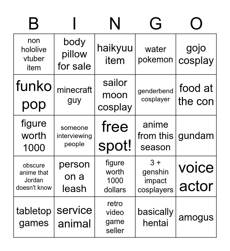 This bingo card has a free space and 24 words: person on a leash, service animal, sailor moon cosplay, tabletop games, gojo cosplay, non hololive vtuber item, funko pop, body pillow for sale, anime from this season, figure worth 1000 dollars, genderbend cosplayer, figure worth 1000, 3 + genshin impact cosplayers, voice actor, minecraft guy, basically hentai, gundam, haikyuu item, food at the con, someone interviewing people, amogus, obscure anime that Jordan doesn't know, water pokemon and retro video game seller.