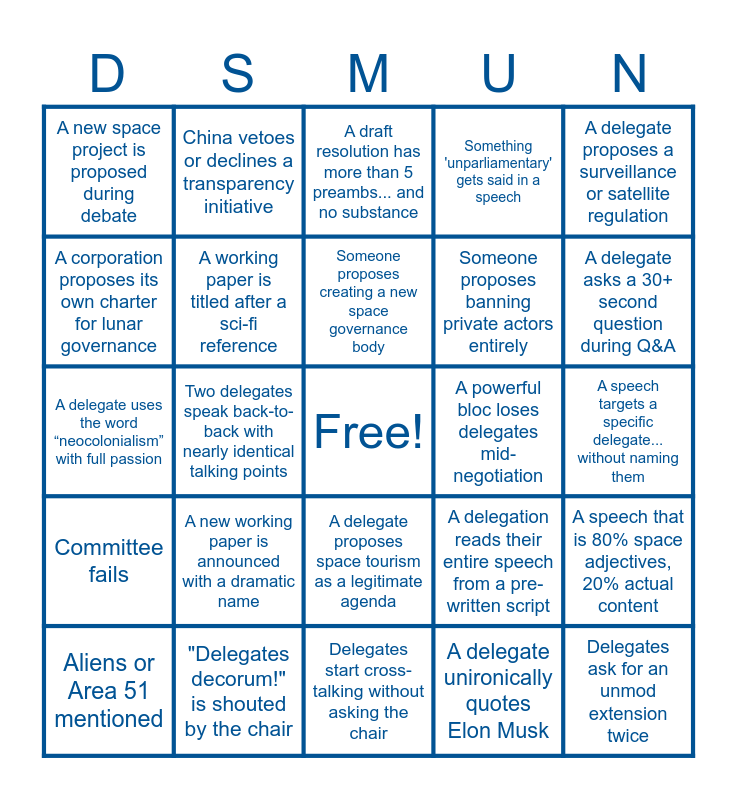This bingo card has a free space and 24 words: A new working paper is announced with a dramatic name, "Delegates decorum!" is shouted by the chair, Someone proposes creating a new space governance body, Aliens or Area 51 mentioned, A delegate proposes a surveillance or satellite regulation, A new space project is proposed during debate, A corporation proposes its own charter for lunar governance, China vetoes or declines a transparency initiative, A powerful bloc loses delegates mid-negotiation, A delegate proposes space tourism as a legitimate agenda, Someone proposes banning private actors entirely, A delegate uses the word “neocolonialism” with full passion, A delegation reads their entire speech from a pre-written script, A speech that is 80% space adjectives, 20% actual content, A working paper is titled after a sci-fi reference, A delegate unironically quotes Elon Musk, A speech targets a specific delegate... without naming them, A draft resolution has more than 5 preambs... and no substance, A delegate asks a 30+ second question during Q&A, Two delegates speak back-to-back with nearly identical talking points, Delegates ask for an unmod extension twice, Committee fails, Something 'unparliamentary' gets said in a speech and Delegates start cross-talking without asking the chair.