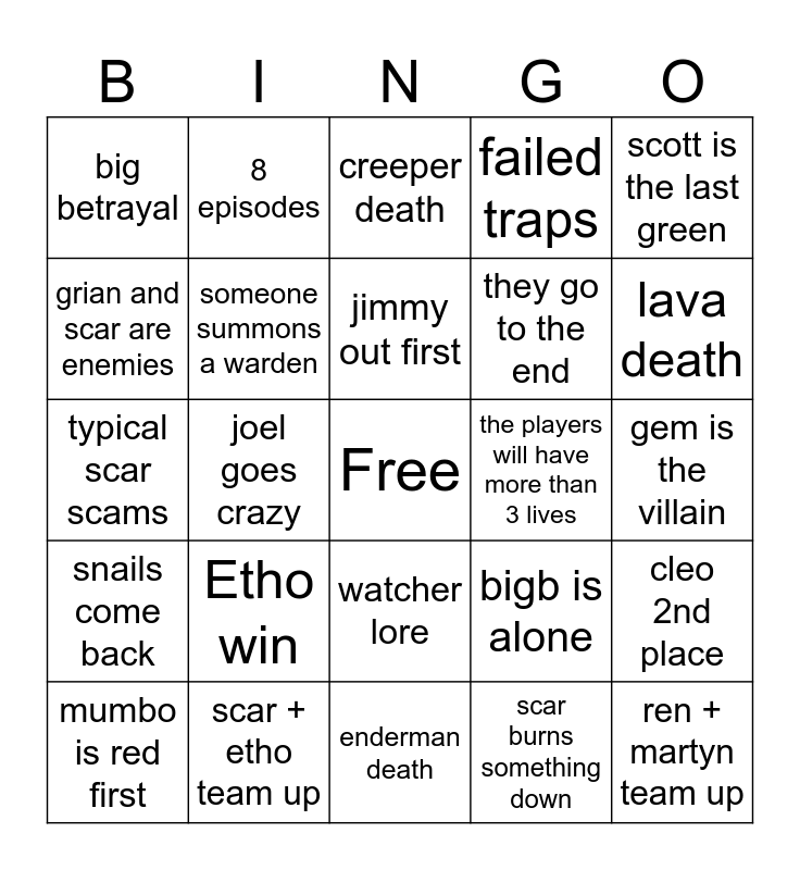 This bingo card has a free space and 24 words: Etho win, scar + etho team up, jimmy out first, mumbo is red first, scott is the last green, big betrayal, grian and scar are enemies, 8 episodes, the players will have more than 3 lives, watcher lore, they go to the end, typical scar scams, bigb is alone, cleo 2nd place, someone summons a warden, scar burns something down, gem is the villain, creeper death, lava death, joel goes crazy, ren + martyn team up, snails come back, failed traps and enderman death.
