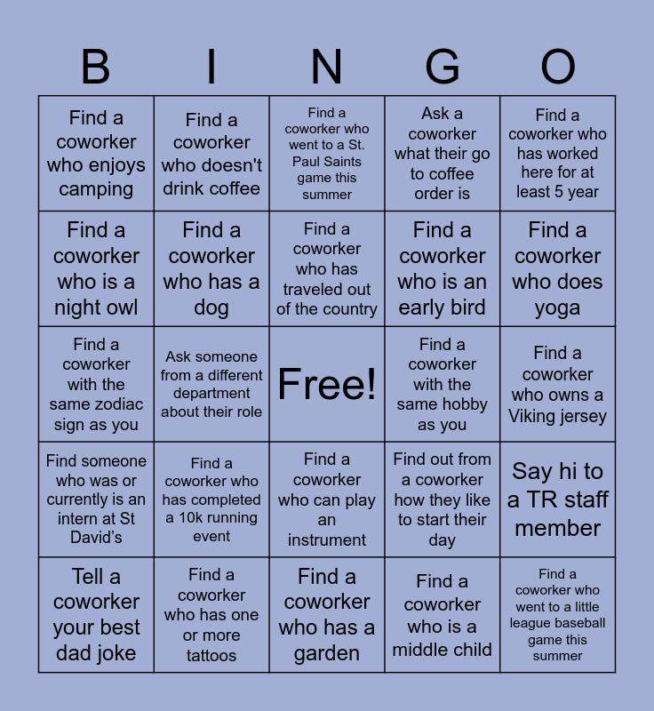 This bingo card has a free space and 36 words: Find a coworker whose favorite color is pink, Find a coworker who has a pet cat, Find a coworker who has a brother, Find a coworker who has a dog, Find out from a coworker how they like to start their day, Find someone who was or currently is an intern at St David’s, Find a coworker who has traveled out of the country, Find a coworker who is bilingual, Find a coworker who has worked here for at least 5 year, Find a coworker who has worked here for at least 10 years, Ask someone from a different department about their role, Ask a coworker what their go to coffee order is, Find a coworker who has the same favorite season as you, Find a coworker with the same hobby as you, Find a coworker who does yoga, Find a coworker who enjoys camping, Ask a coworker their favorite snack, Find a coworker who has completed a 10k running event, Find a coworker who went to a little league baseball game this summer, Find a coworker who went to a St. Paul Saints game this summer, Find a coworker who owns a Viking jersey, Say hi to a TR staff member, Find a coworker who has one or more tattoos, Tell a coworker your best dad joke, Find a coworker who has a garden, Find a coworker who doesn't drink coffee, Find a coworker with the same zodiac sign as you, Find a coworker who is an avid book reader, Find a coworker who is an early bird, Find a coworker who is a night owl, Find a coworker who has lived in another state, Find a coworker with a shorter commute than you, Find a coworker who is a middle child, Find a coworker who can play an instrument, Find someone who can sing every word to the Fesh Prince of Bel Air theme song and Show a coworker your best dance move.